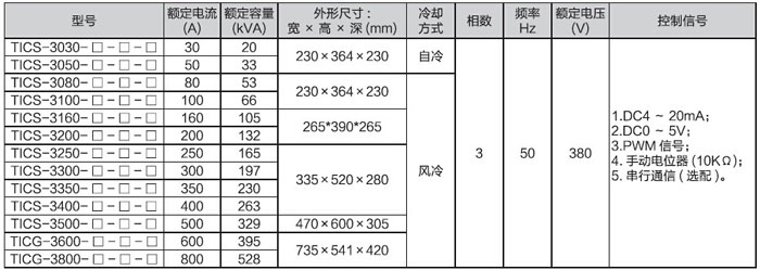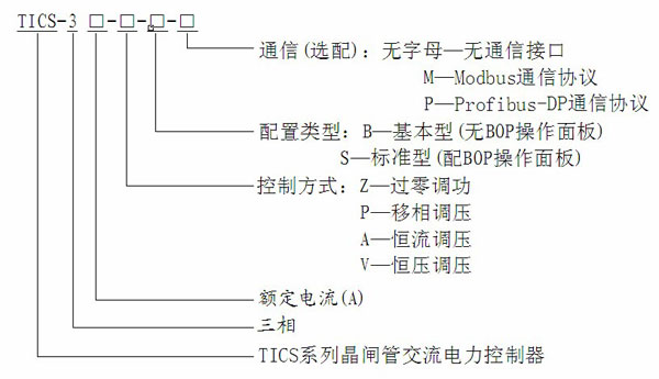 例如,訂貨號:TICS-3200-Z-S-M,表示:TICS系列三相交流電力控制器——額定電流300A/周波調功/標準型/Modbus通信接口。